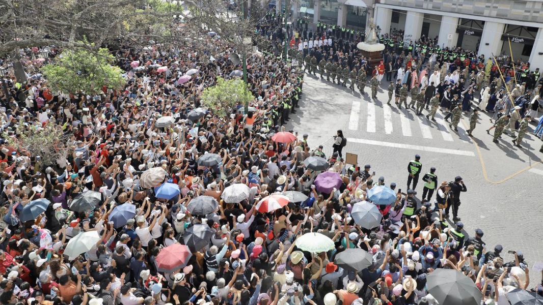 Con el repique de las campanas, la procesión comenzó con la salida de la Cruz Mayor, la Virgen de las Lágrimas, la Virgen del Milagro y el Señor del Milagro, a la explanada de la Catedral.