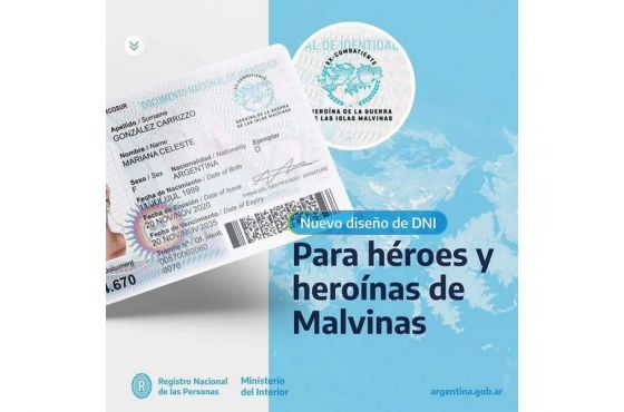 El Registro Civil informa que por disposición nacional ya se oficializó el nuevo diseño del Documento Nacional de Identidad (DNI) que está destinado exclusivamente a excombatientes de la guerra de Malvinas. Los mismos tendrán desde ahora en adelante, una insignia identificatoria en sus ejemplares; esto quedó oficializado a través de la Disposición 214 en consonancia con lo marcado en el artículo 17 inciso f) de la Ley Nº 17.671.
