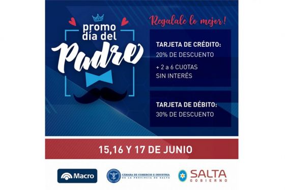 El Gobierno de la Provincia a través de los Ministerios de Economía y Servicios Públicos, y de Producción y Desarrollo Sustentable; banco Macro y la Cámara de Comercio e Industria de Salta, lanzarán mañana la Promo Día del Padre, en la sede de la Cámara de Comercio.