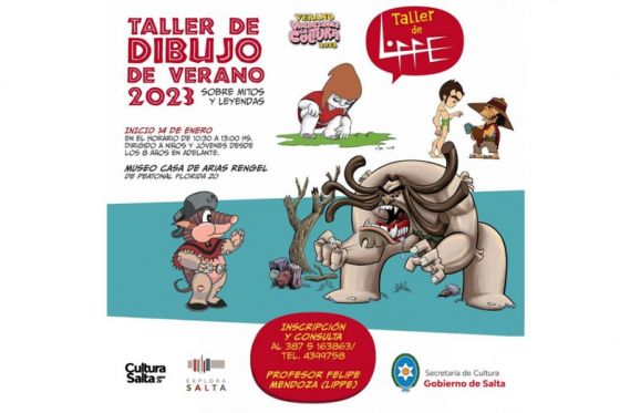 El Taller de Dibujos de Mitos y Leyendas se llevará a cabo en Explora Salta, ubicado en La Florida 20, todos los sábados de enero y febrero dando inicio este sábado 14 de enero. La actividad está destinada a niños a partir de los 8 años, sin cupo máximo. Cada clase tendrá un costo de $1.500, con todos los materiales incluidos. Para más informes e inscripción, comunicarse al 3875163863 (Profesor Felipe Mendoza).